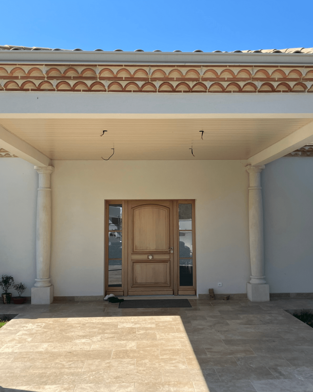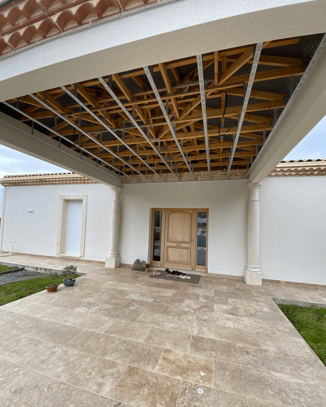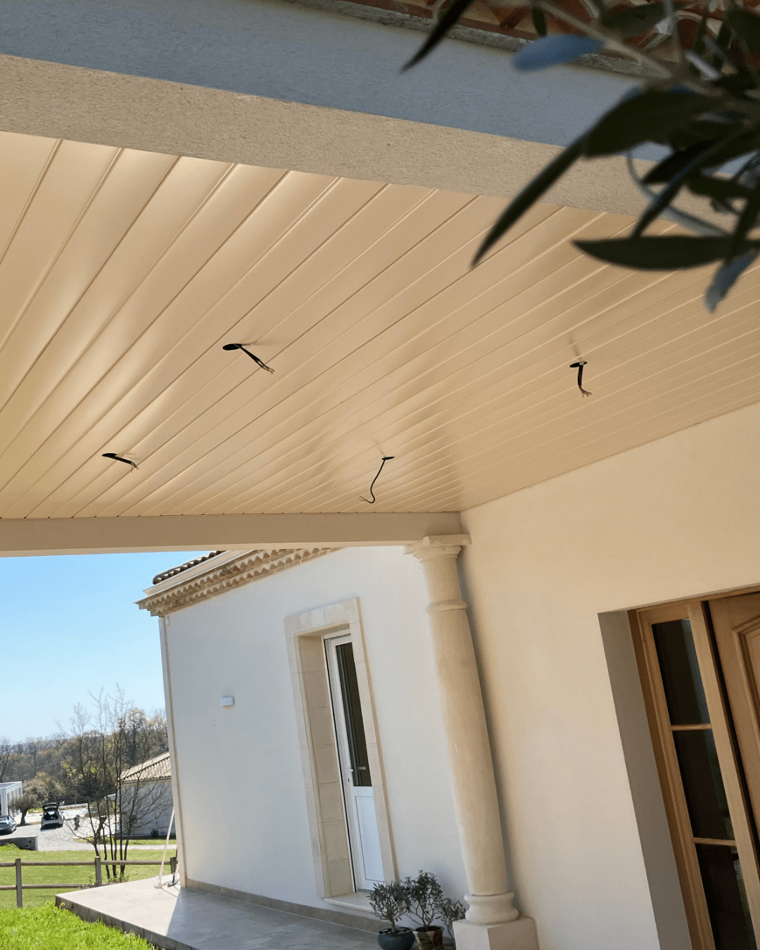 Réalisation d’un habillage de porche avec un lambris de sous-face en aluminium laqué ton pierre, posé sur mesure en grandes longueurs pour une intégration parfaite à l’existant.